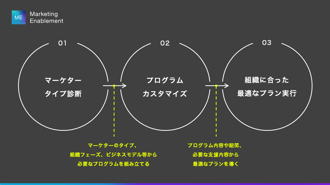 そしてマーケターとしてのタイプ、特性を押さえた上でプログラムを設計していきます。無料トライアルでは、マーケタータイプ診断と、基礎プログラムをお試し頂く事が可能です。