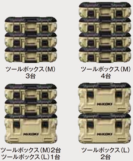 キャリーボックスを土台に、ツールボックス(M)、ツールボックス(L)を縦積みにして固定できます。大容量で電動工具やバッテリーはもちろん、アクセサリ類も一括収納できます。
