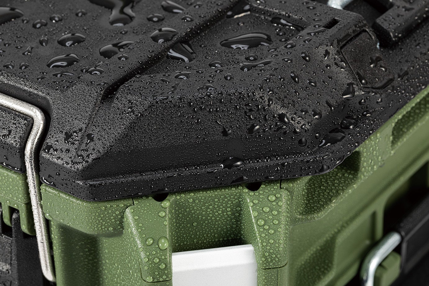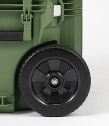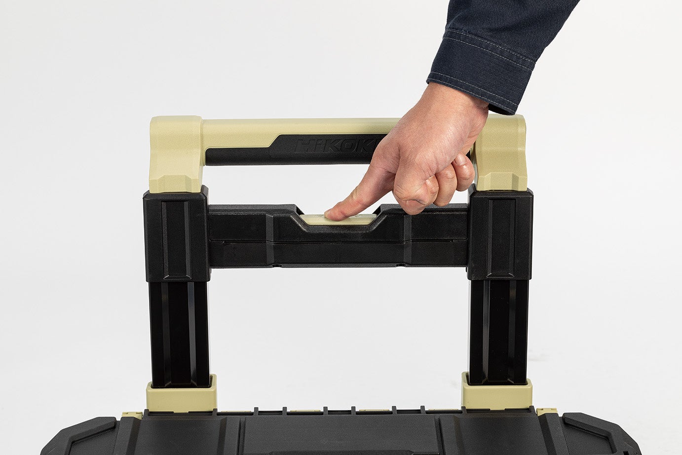 卓越したボディ強度で耐荷重最大120kg※1を実現している他、防塵・耐水IP65※2を取得しているので土ほこりや急な雨でも安心して使えます。また、樹脂+ゴム材の大径9インチの大型タイヤを採用しているので荒れた路面や段差でも安定した走行性を発揮する他、ボックス同士を固定する左右2箇所のスタックラッチが衝撃によるズレ落ちを防ぎます。シーンや用途に合わせて、ツールボックスを追加し、組み合わせて使うことができます。