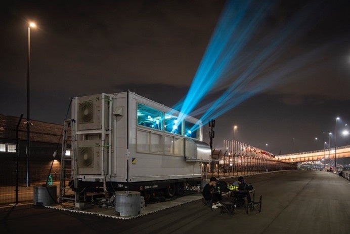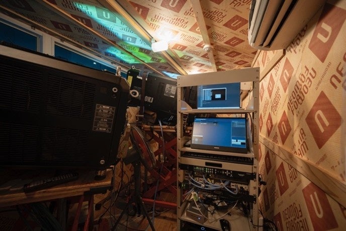 投影は、会場東ゲートの外側に設置したコンテナから、全長約132mもの壁面を余すことなく使用するため、5万ルーメンの高輝度プロジェクター5台を横に並べて実施されました。コンテナ内部は、オペレーション作業を行うためのわずかなスペースがある以外、数多くの精密機器で埋め尽くされていました。「MEGA CANVAS」では、「時間」「地域」「夢」「笑顔」「文化」というテーマに沿った映像作品が投影され、大阪府や観光事業者、アーティスト、学生など多様なパートナーが作品を出品しました。万博開催中、東ゲートから見えるヨコレイの物流倉庫は存在感が抜群で、パビリオンと勘違いする人も多かったとされています。