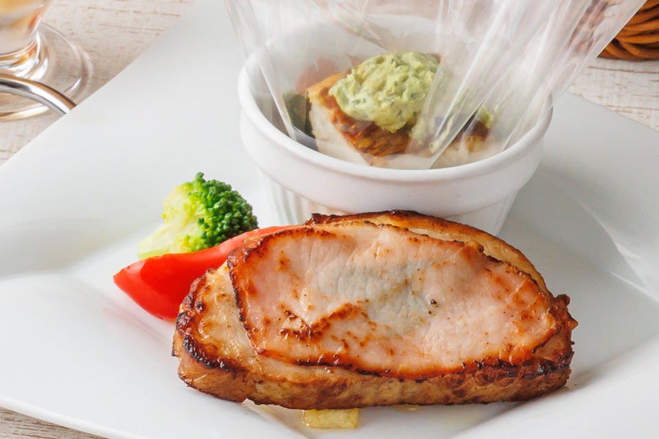 期間後半8月16日(火)から9月30日(金)までの限定メニューは『ポークロース肉のサルティンボッカ風』と『シーフードのカルトッチョ』の2種類。脂身の少ない豚ロース肉にセージを生ハムをのせて焼いたサルティンボッカはほのかに感じるセージの爽やかな香りが白ワインとバターで作ったソースによく合う一品です。