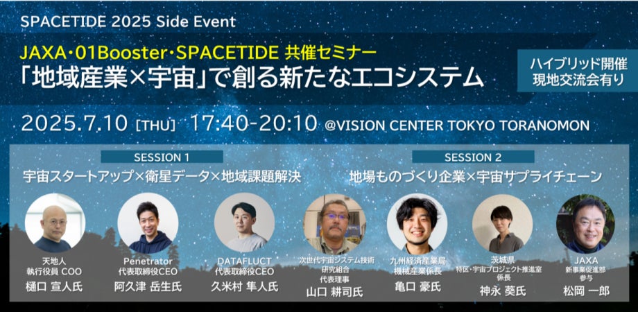 JAXA認定の宇宙ベンチャー 株式会社天地人(東京都中央区 代表取締役 櫻庭康人)は、2025年7月10日(木)にSPACETIDE 2025のサイドイベントとして開催されるJAXA・01Booster・SPACETIDEの共催セミナー【「地域産業×宇宙」で創る新たなエコシステム】に登壇することをお知らせします。