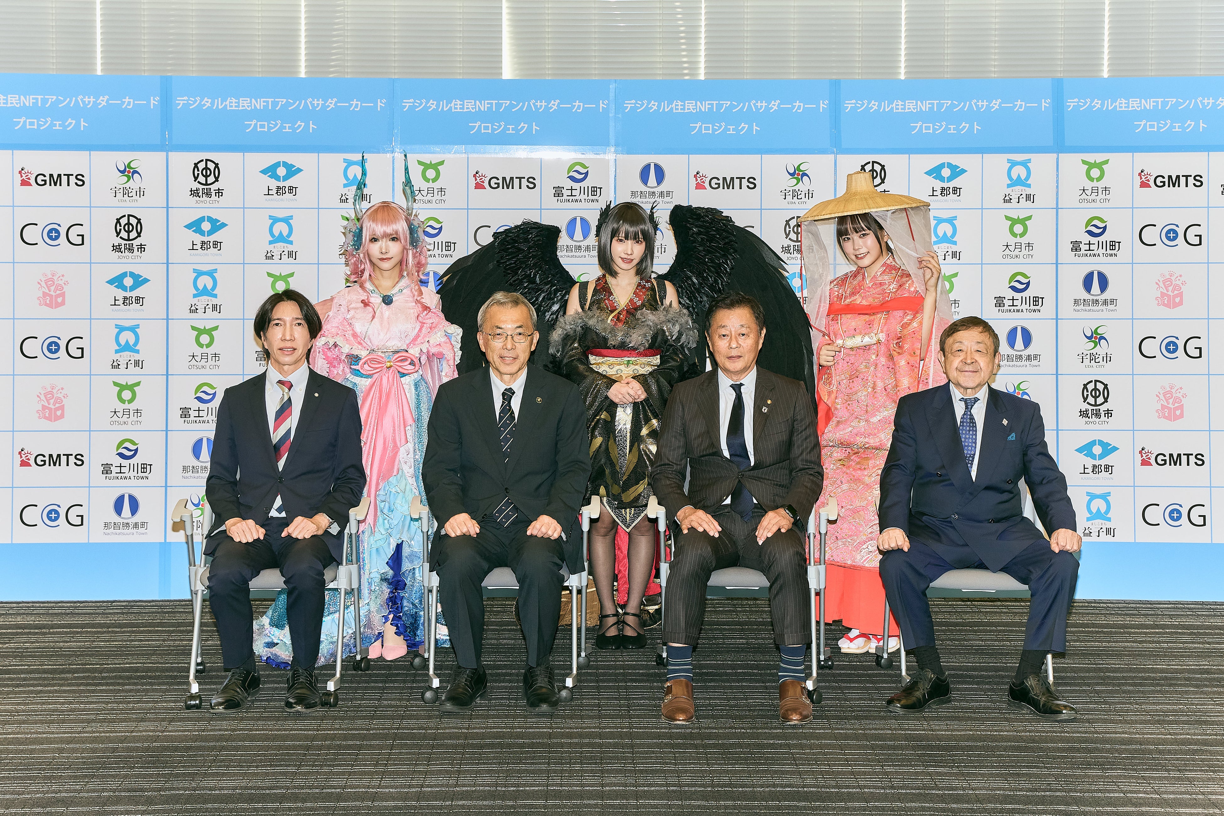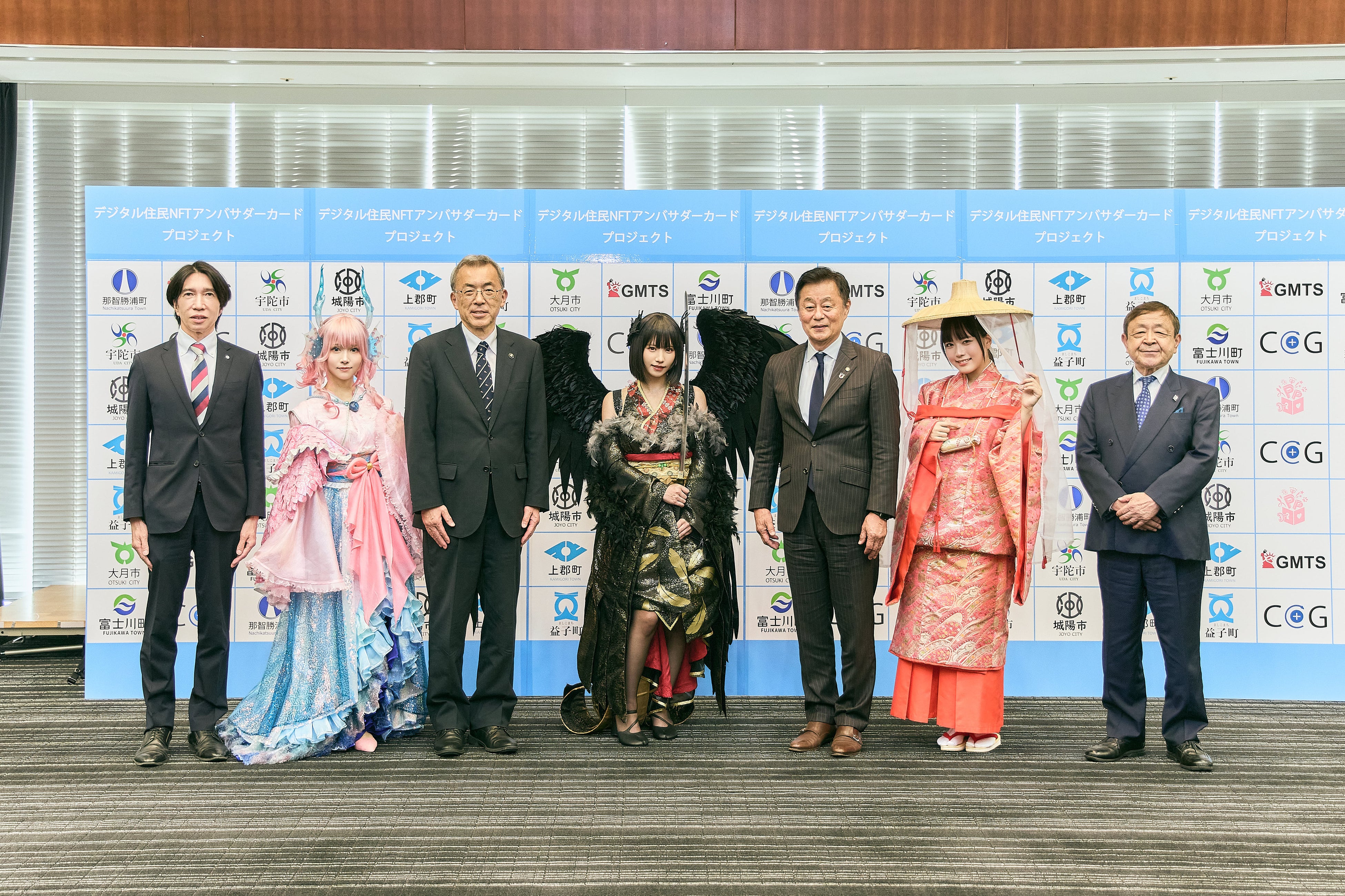 2024年11月7日(木)に参議院議員会館講堂で行われた記者発表会では、多数の報道陣が集まるなかで環境大臣政務官の朝日健太郎 参議院議員、奈良県宇陀市の金剛一智市長、和歌山県那智勝浦町の堀順一郎町長、山梨県大月市の小林信保市長、兵庫県上郡町の梅田修作町長や、人気コスプレイヤーのえなこ(SNS/YOUTUBE フォロワー数 250 万人)、東雲うみ(SNS/YOUTUBE フォロワー数 150 万人)、えい梨(SNS/YOUTUBE フォロワー数 26.5 万人)氏らがデジタル住民NFT「アンバサダー」カードの魅力をPRしました。