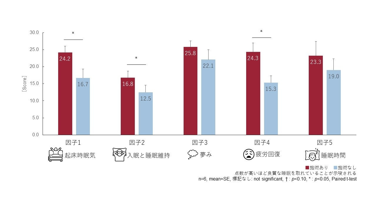 自身の睡眠を評価するアンケート評価から、以下の5つの睡眠因子に分類しました。そのうち「1. 起床時眠気」と「2.入眠と睡眠維持」と「4.疲労回復」において、施術を受けた日は受けなかった日よりも、有意に点数が高いことが確認されました。