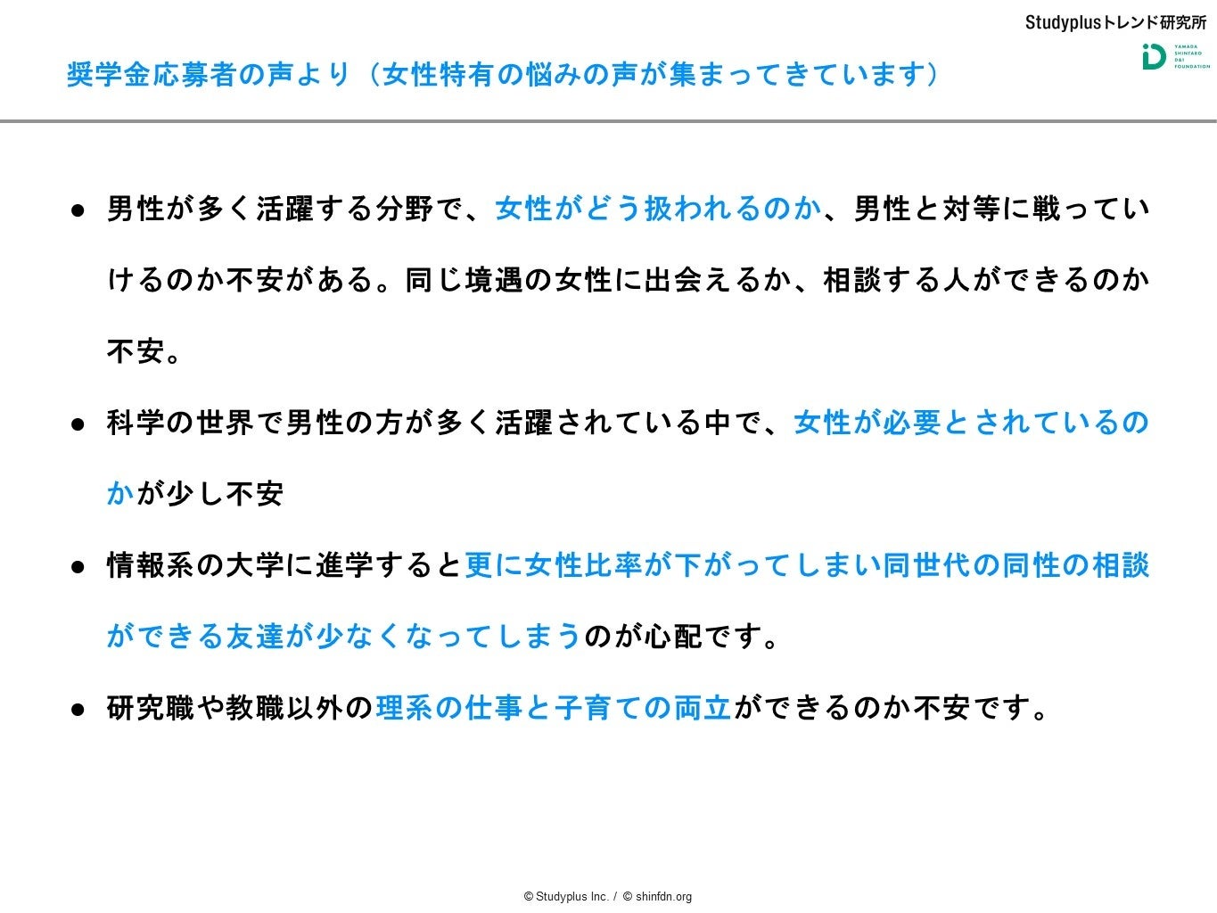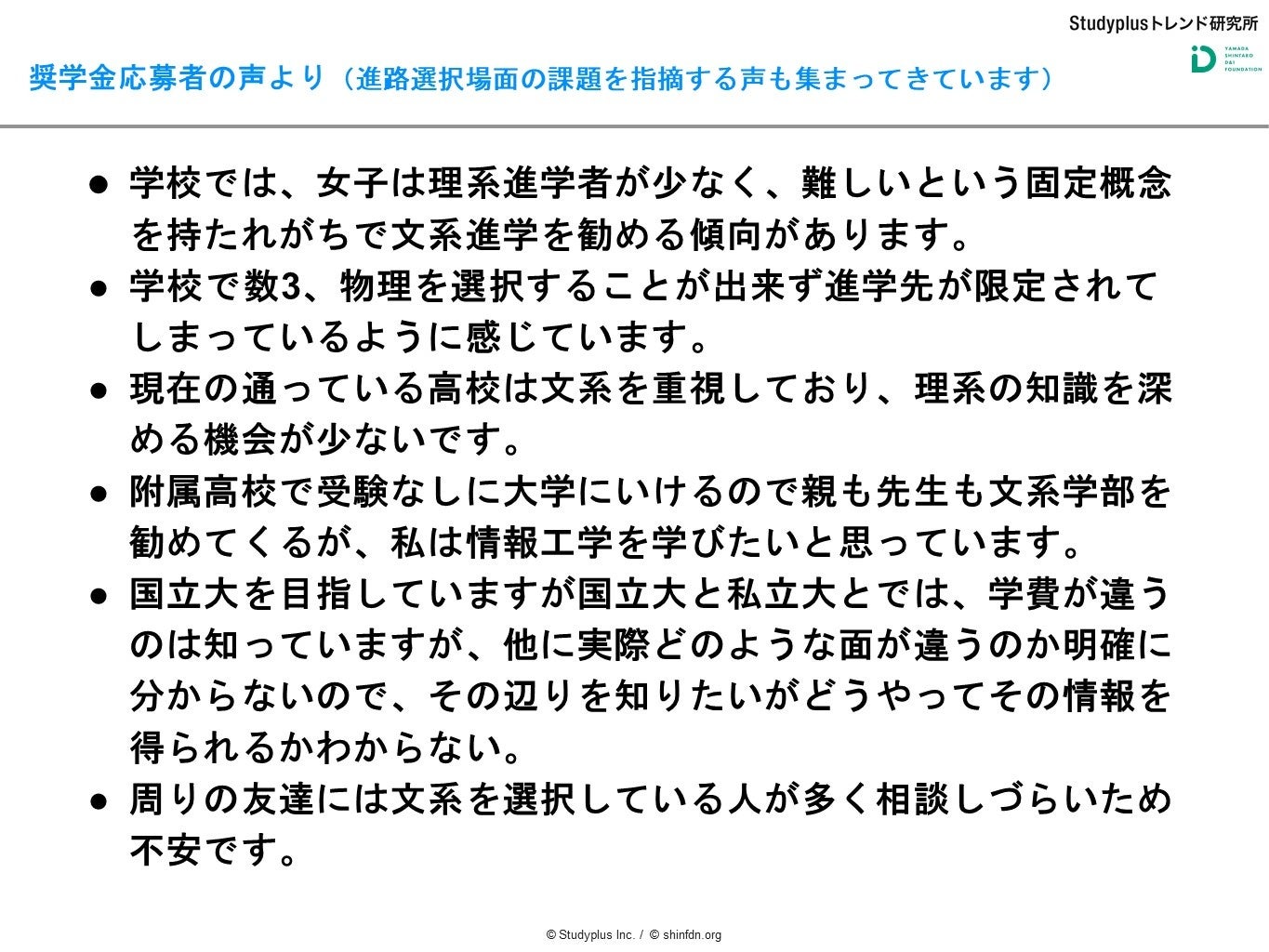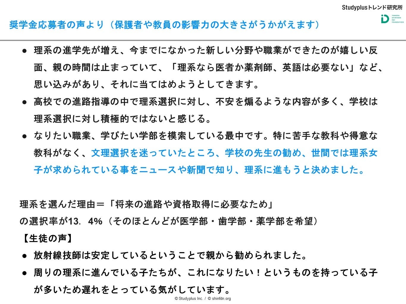 画像の声の3つ目にもありますが、決め手がなくて悩んでいた時に「社会から理系の女性が求められている」という情報があれば、求められているならチャレンジしようという勇気も湧いてくると思います。全国で入試の時点で、STEM分野に進学する女子枠が生まれていることや、私たちの奨学金も後押ししたい気持ちで提供しているので、ぜひ生徒に情報提供いただけると嬉しいです。