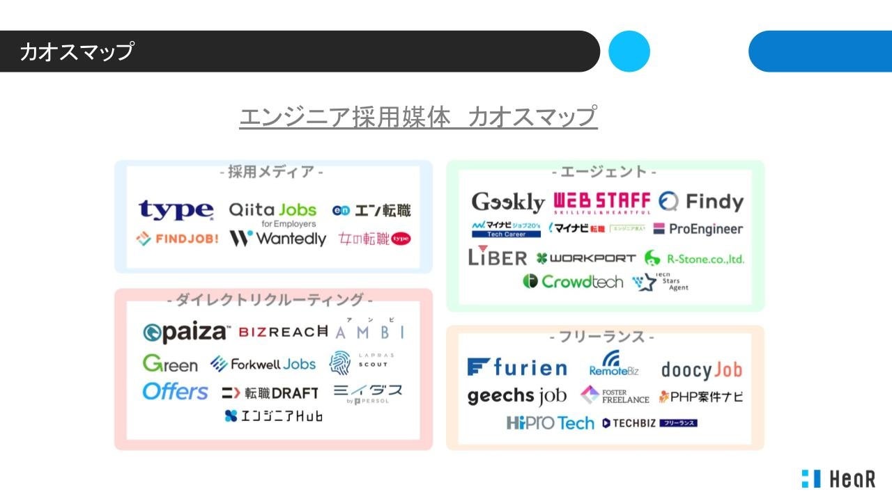 そこで、多数のコンサルティング・採用業務代行支援を行う中で、様々な媒体運用を手掛けてきたHeaRが、エンジニア採用における「最新の採用媒体カオスマップ」と「それぞれのサービスの特徴・強み」をまとめて解説した、エンジニア採用向け媒体の最新情報を盛り込んだホワイトペーパーを公開する運びとなりました。