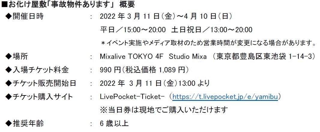 株式会社NTTぷらら(本社:東京都豊島区、代表取締役社長:永田勝美、以下 NTTぷらら)は、ドラマとお化け屋敷を連動させたホラープロジェクト「闇部 –REAL-」の第二弾として、お化け屋敷「事故物件あります」を2022年3月11日(金)から4月10日(日)までの期間限定で、エンターテインメイント施設「Mixalive TOKYO」(東京・池袋)にオープンすることを決定しました。※1