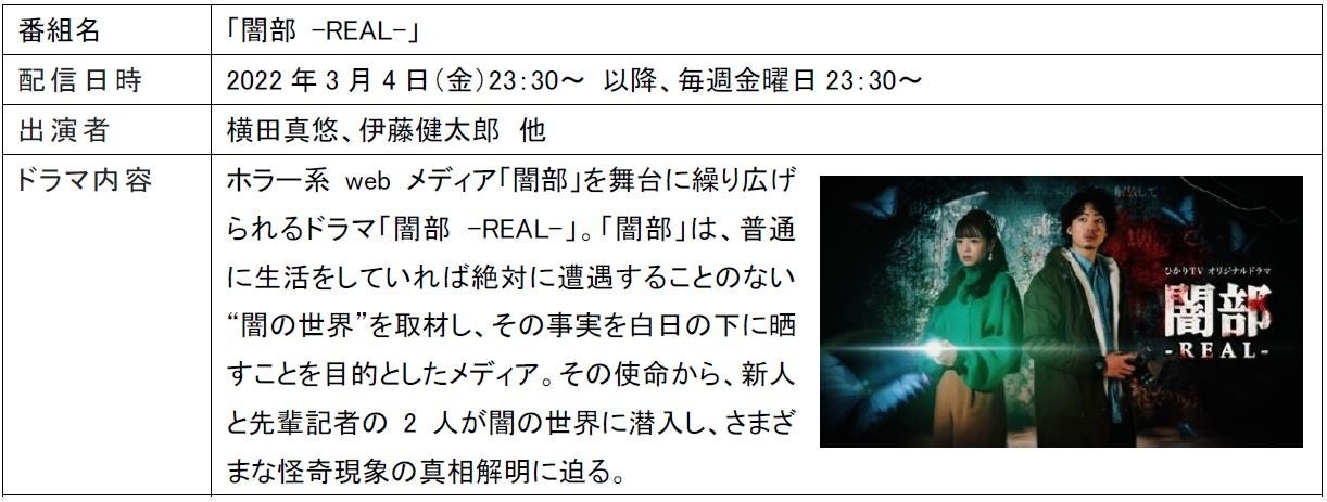 「闇部 -REAL-」を製作し、当社が運営する映像配信サービス「ひかりTV」にて3月4日(金)より独占配信を予定しています。