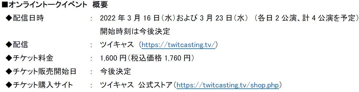 ◆配信日時 :2022年3月16日(水)および3月23日(水) (各日2公演、計4公演を予定)