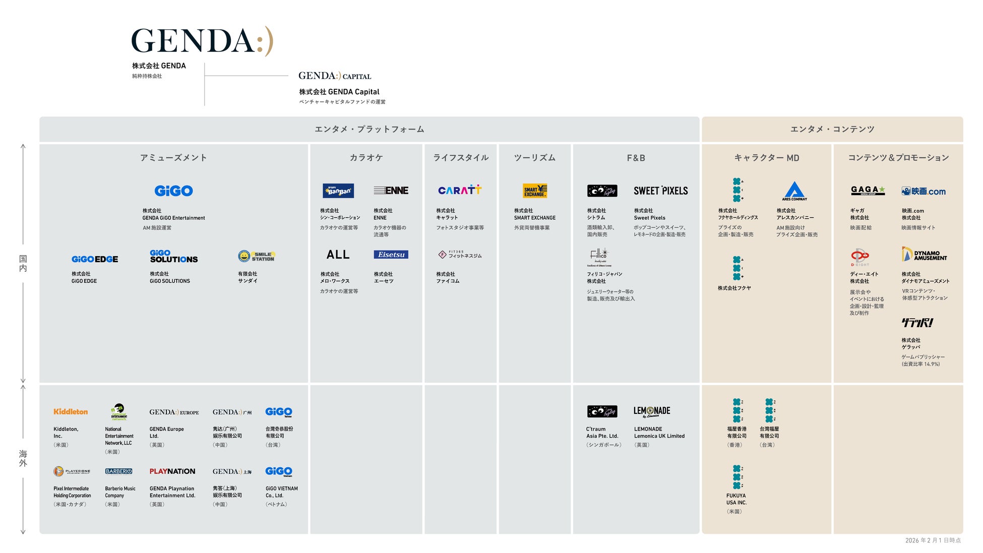 アミューズメント、カラオケ、ライフスタイル、ツーリズム、フード&ビバレッジ、キャラクター・マーチャンダイジング、コンテンツ&プロモーション(映画や体験型コンテンツ等)などエンターテイメントにおいて幅広く事業を展開しています。国内外で「GiGO」等のアミューズメント施設やカラオケチェーン店「カラオケBanBan」、フォトスタジオ「スタジオキャラット」等を合わせて約1,100店舗、ミニロケ(主に30台以下のゲーム機を設置するゲームコーナー)を約13,000箇所運営しています。日本、米国、カナダ、英国、アイルランド、オランダ、中国大陸、香港、台湾、シンガポール、ベトナム等の地域において事業展開しております。