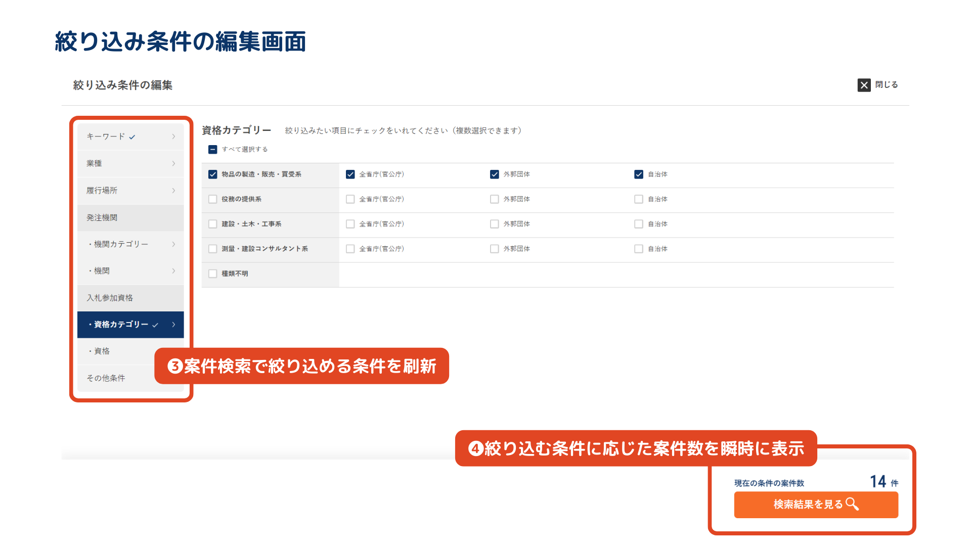 また「絞り込み条件の編集画面」では、どのような条件で絞り込みできるのかが一目でわかり(③)、検索条件を絞る毎にリアルタイムでその条件に当てはまる案件数が表示(④)されます。より幅広い選択肢から絞り込み検索をし、自社に関連度の高い案件を効率よく発見できます。