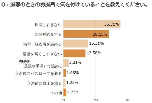 トップに上がったのが“長湯しすぎない”。あまり長湯しすぎてしまうと体力消耗してしまうため、風邪のときには普段よりも短めの入浴にするようにしましょう。また、湯温を高くしすぎるのも同様に体力消耗の原因となりますので、39℃前後のぬるま湯に設定しましょう。 2位の水分補給・3位の浴室脱衣所を温めるもとても重要です。 水分補給は入浴前後に行い、脱水症状を起こさないよう気をつけましょう。また、湯冷めでは風邪悪化に繋がりますので、浴室・脱衣所は入浴前に温めておくこともポイントです。