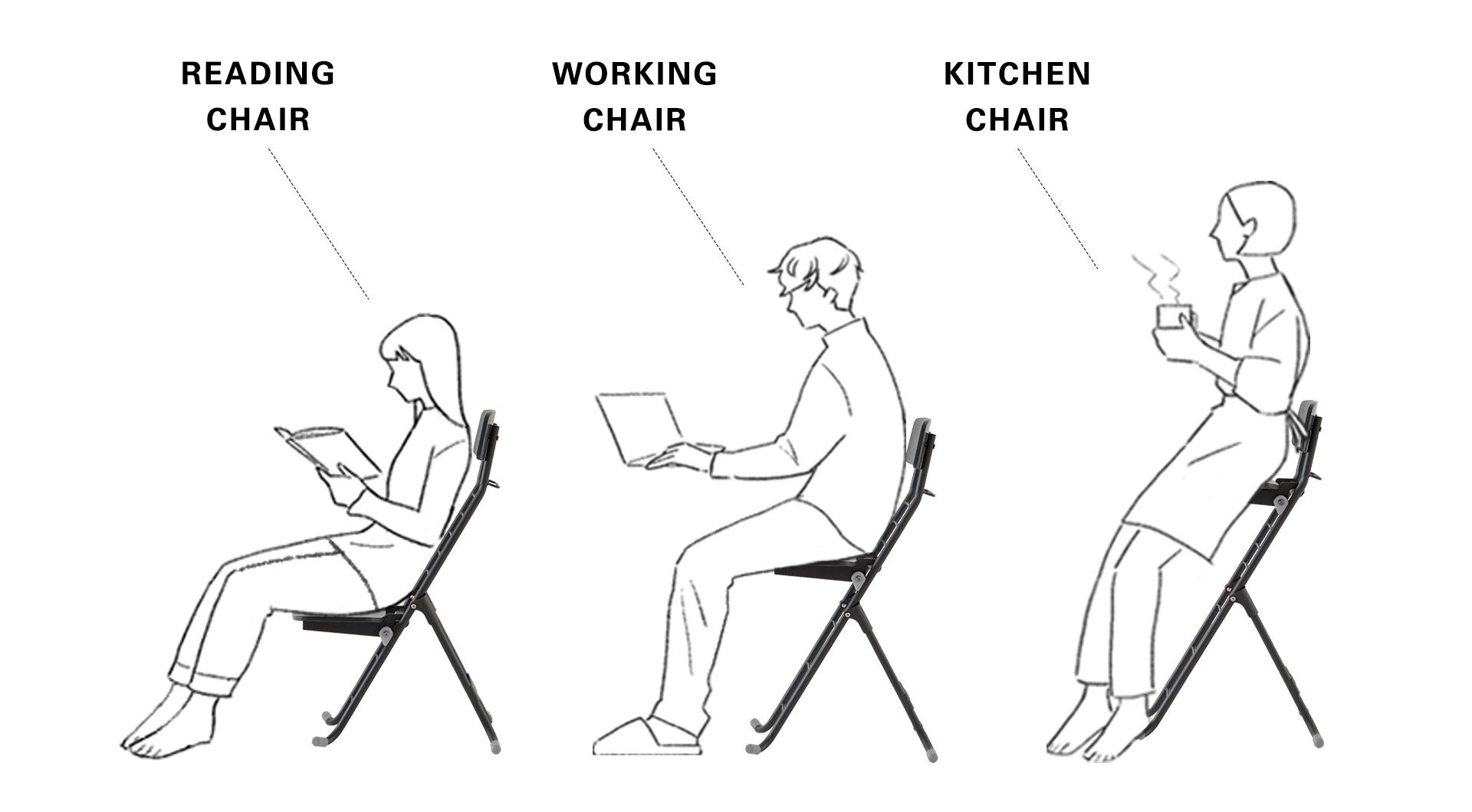 ひと口に“座る”といっても、行う作業によって適した姿勢は異なります。例えば、①本を読む②デスクワーク③作業中の小休止など。ロブションはあらゆるシーンで適切で健康的な座り姿勢を支えることを目的に開発されました。