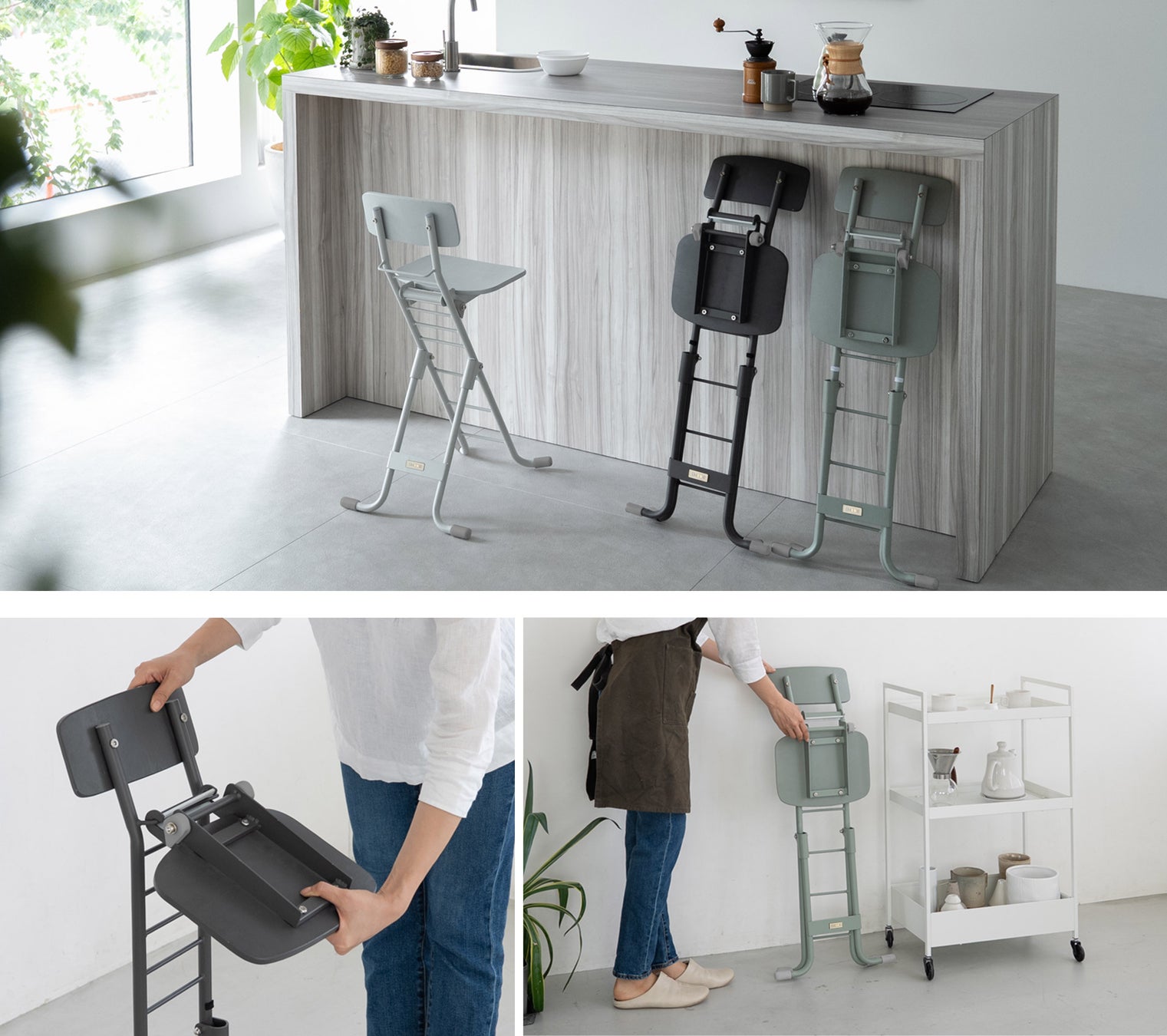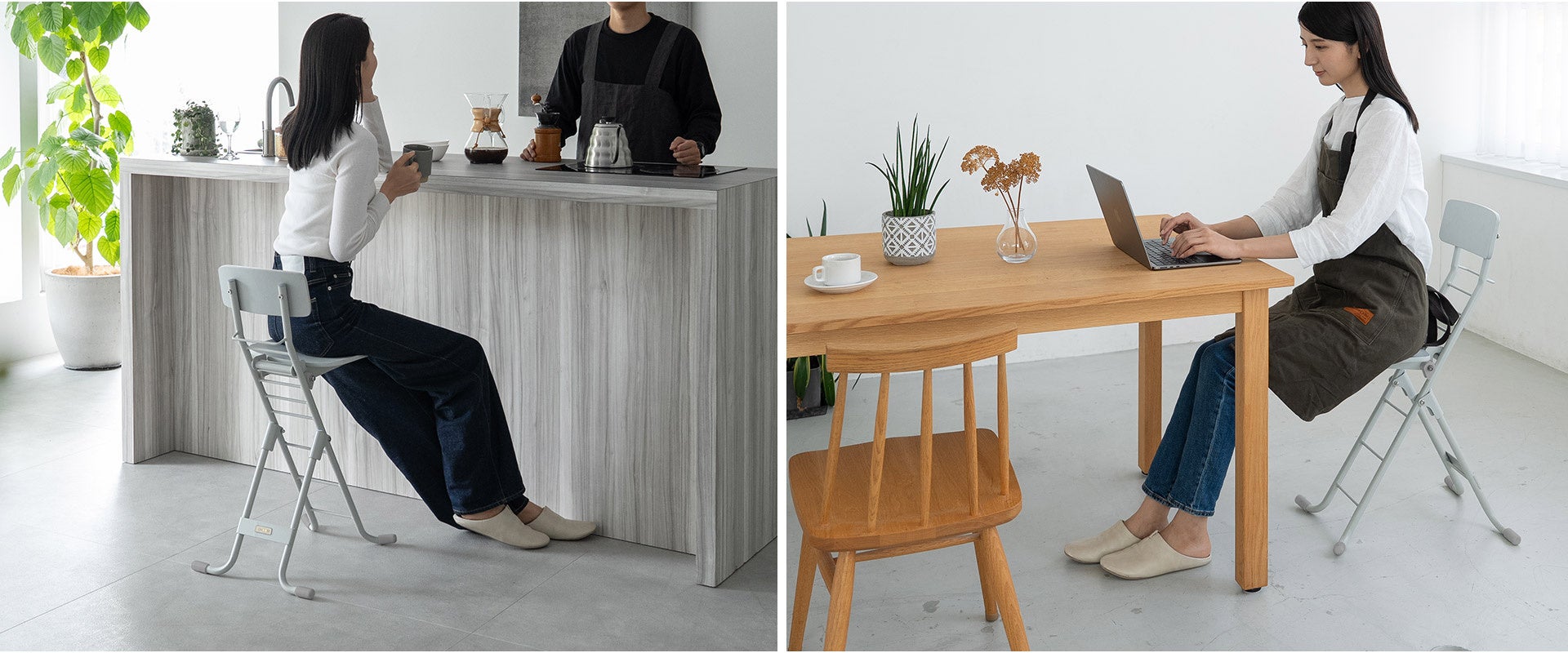 ロブションは、折りたたむことで壁際や隙間などにスリムに収納できるのはもちろん、ちょっと座りたいときに手軽に使える、そんな生活シーンを想定して”畳んだ姿も美しい”という点にもこだわっています。キッチン/リビング/オフィスなどに人目につくところでも魅せる家具として圧迫感なく配置できます。