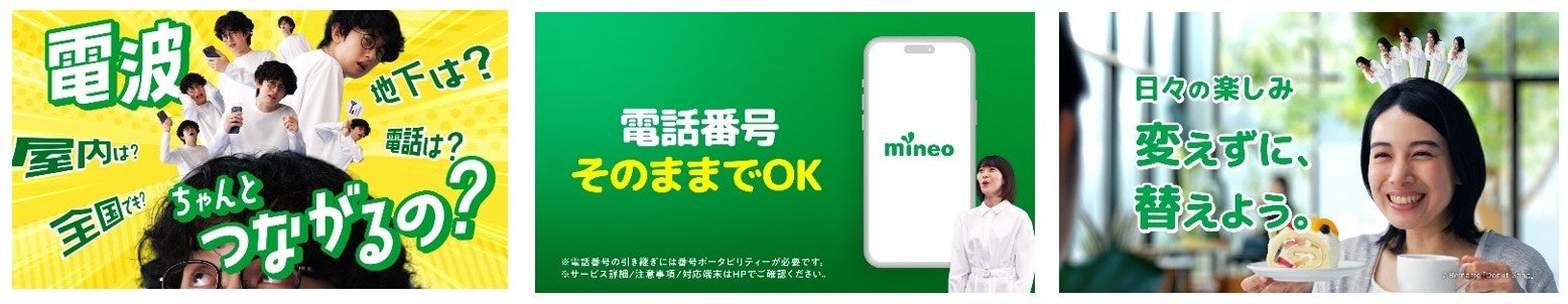 またキャンペーンと同時に、「変えたくないもの、そのままにできる」をコンセプトとしたテレビCMを放映いたします。CMでは、「つながるエリア」「電話番号」など、携帯電話の乗換時の不安をストレートに表現した内容になっており、mineoをご契約いただくことで、電話番号や回線(au/ドコモ/ソフトバンク)など、変えたくないものはそのままに、おトクにご利用いただけることを「変えずに替えよう」のフレーズとともにお伝えしています。
