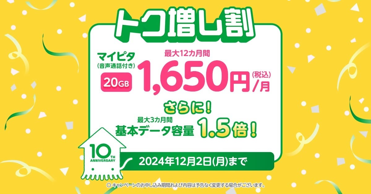 株式会社オプテージ(大阪市中央区)は、携帯電話サービス「mineo(マイネオ)」において、2024年10月1日(火)より、「トク増し割」として、データ容量で選ぶプラン「マイピタ」のデュアルタイプ(音声通話付き)のご契約で、月額基本料金が最大12カ月間528円割引になる「マイピタ最大12カ月間528円割引キャンペーン」および、データ容量が最大3カ月間1.5倍になる「マイピタ最大3カ月間データ容量1.5倍キャンペーン」を実施いたします。