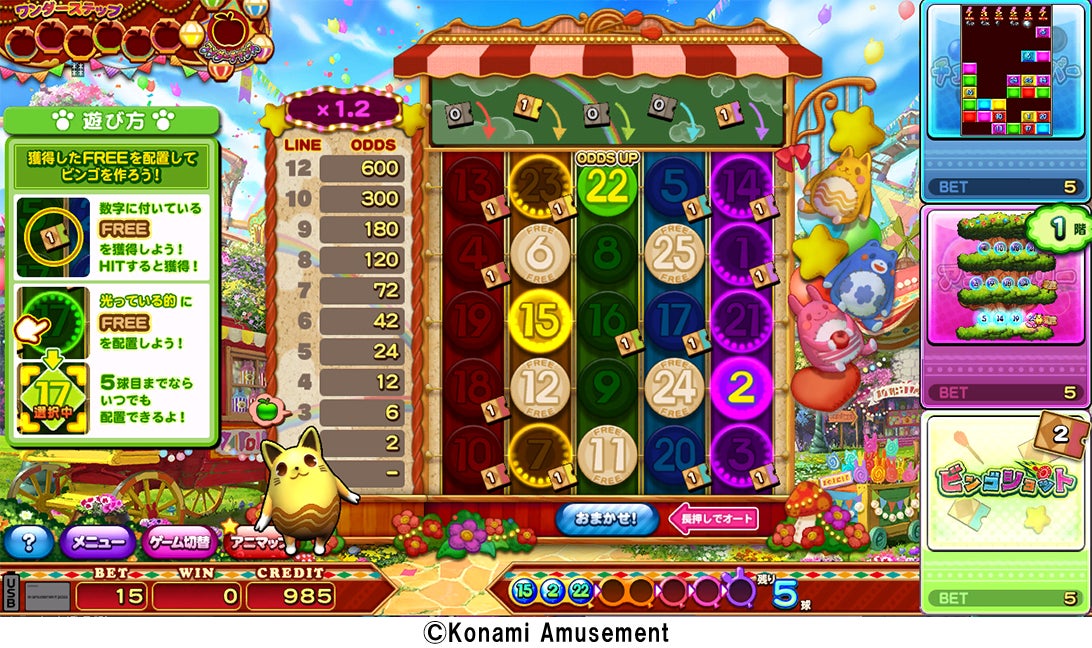 アニマシリーズでも人気のプレーヤー操作要素を取り入れたビンゴゲームです。獲得した「FREE」を自分で配置して高配当を狙います。ビンゴしたライン数により、ワンダーステップを獲得することができます。