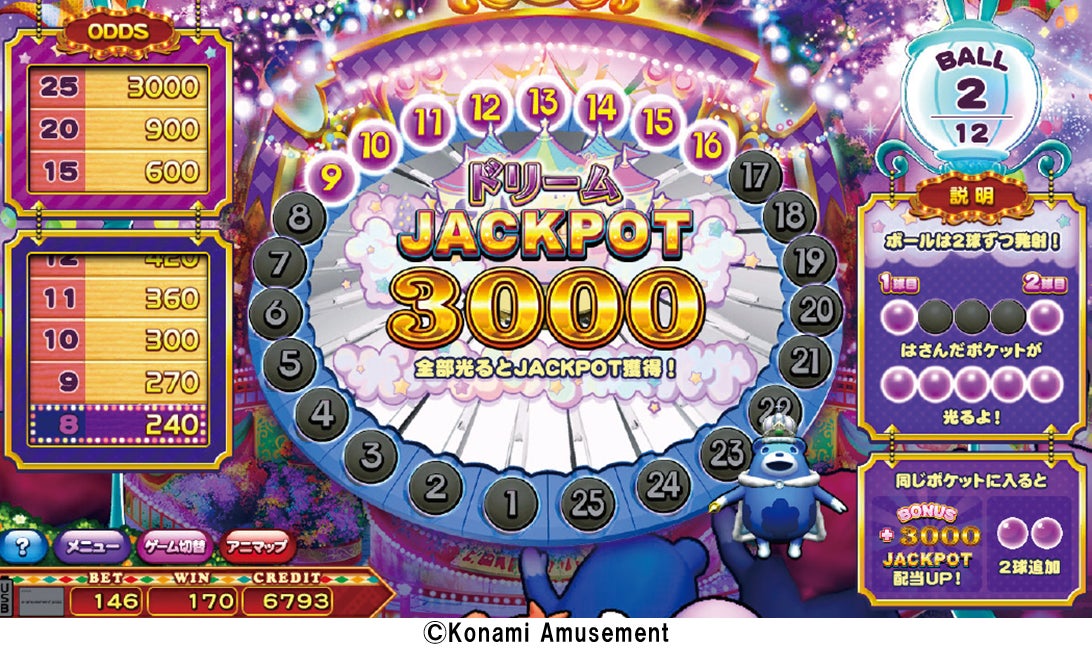 2球のボールで挟んだナンバーポケットが光る新感覚の「ドリーム JACKPOT CHANCE」が登場!ボールは2球ずつ6回、全12球発射されます。光ったナンバーポケット数に応じて配当を獲得することができます。そして、全てのポケットを光らせることができればJACKPOT獲得です。