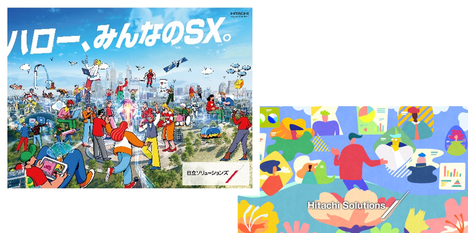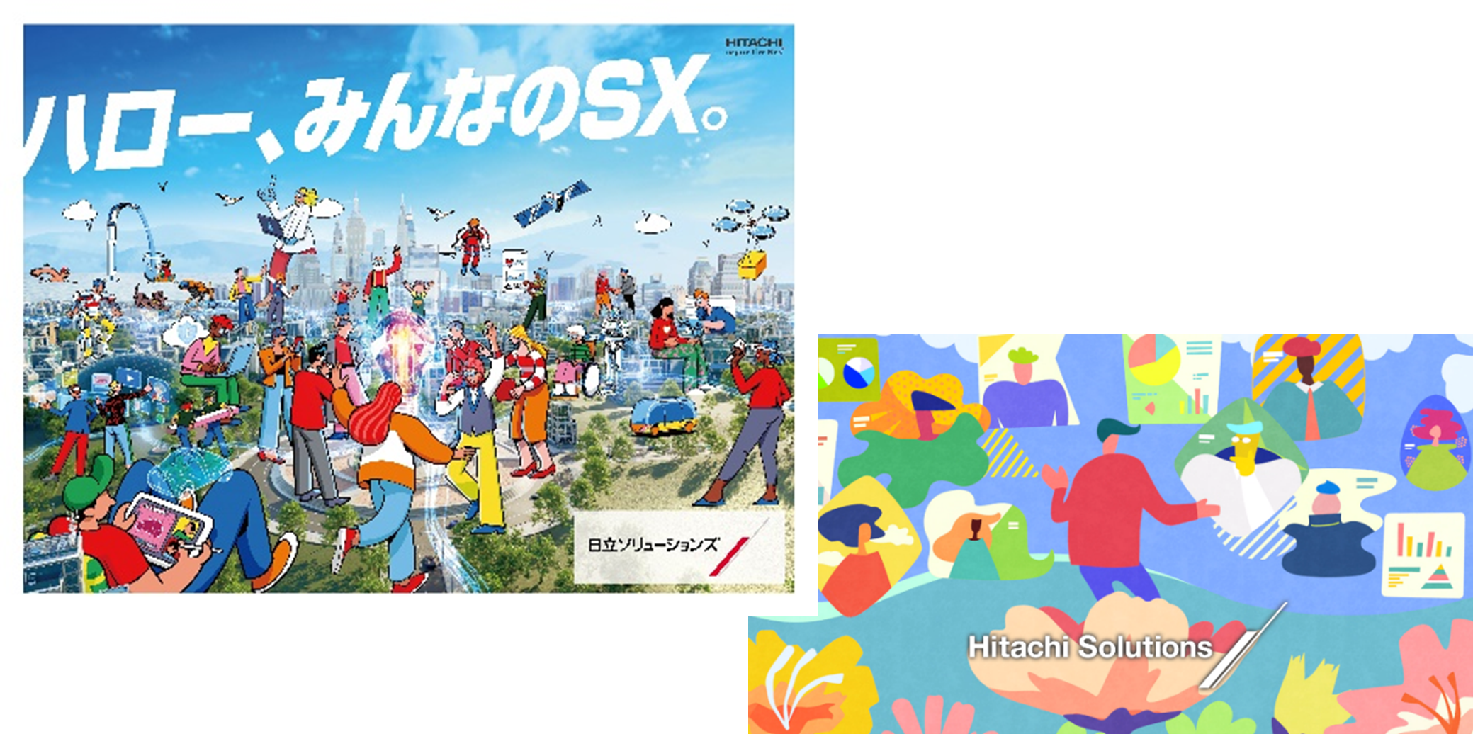 リアルな街を描写して表現した「いま」に、日立ソリューションズが2030年に実現したい「未来」をイラストで重ねるビジュアルとしました。みんなが、ワクワクする未来に向けてSXのもとでオープンに力を合わせ、確かな技術と未来への希望を持ち寄り、「サステナブルな未来は、協創でつくる」という、日立ソリューションズの想いを込め、「ハロー、みんなのSX。」と呼びかけています。