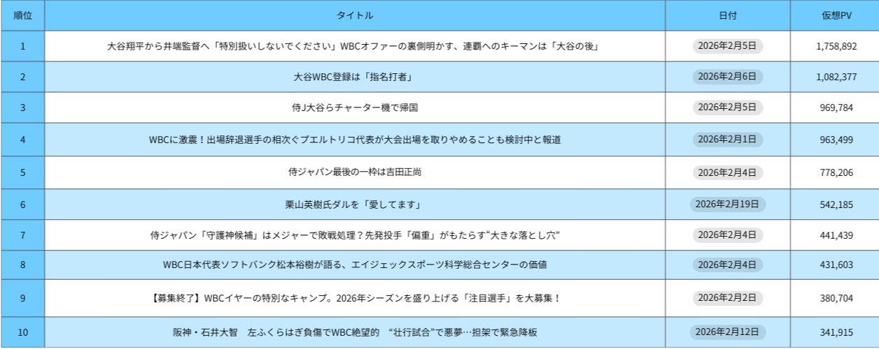 今回、2026年2月1日 ~ 2026年2月20日までの期間に掲載された「WORLD BASEBALL CLASSIC 2026」の記事をPR効果測定サービスQlipperを使いランキングにしました。