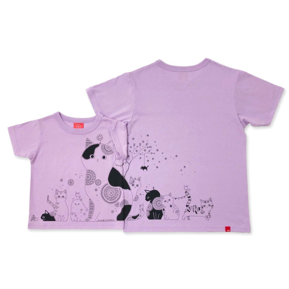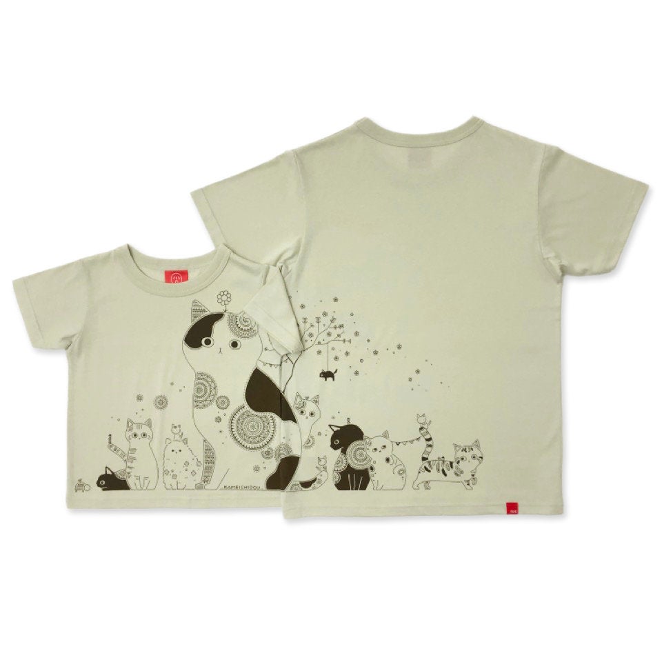 ねこたちのイラストを半袖Tシャツのフロントからバックにかけて大胆にプリントしました。