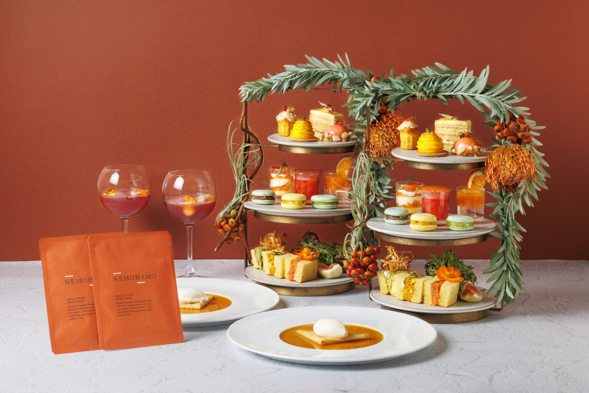 今回のアフタヌーンティーは、「NEMOHAMO」のコンセプトである「植物まるごとのちからを肌へ。」にインスパイアされた、全11種類のスイーツとセイボリーをご用意しました。太陽をたっぷり浴びたようなオレンジ色のパッケージをイメージしたメニューは、秋の豊かな味覚を中心に、京都らしい食材をふんだんに使用しています。特に、冬を迎えるために甘みを増した人参やかぼちゃ、柚子などが、スイーツに季節感を演出します。