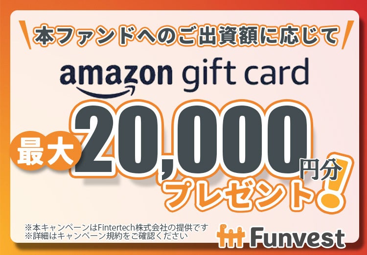 本ファンドへ出資していただいた投資家の皆様を対象として、出資額に応じて最大20,000円分のAmazonギフトカードをプレゼントするキャンペーンも併せて実施いたします。