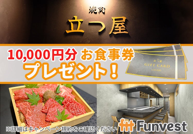 本ファンドに300万円以上の出資でもれなく『焼肉 立つ屋 お食事券(10,000円相当)』をプレゼント!