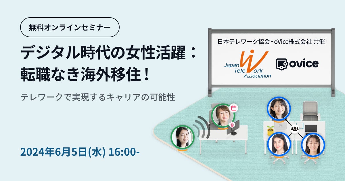 oVice株式会社(本社:石川県七尾市、代表取締役CEO:ジョン・セーヒョン)は、日本テレワーク協会(所在地:東京都千代田区、会長:栗原 博、以下JTA)との共催で、無料オンラインセミナー「デジタル時代の女性活躍:転職なき海外移住〜テレワークで実現するキャリアの可能性〜」を2024年6月5日(水)16時から開催します。