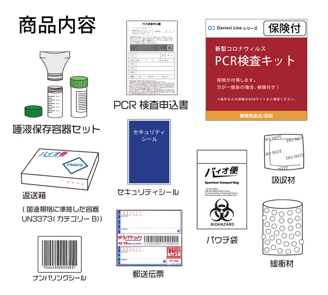 内容:唾液保存容器セット×1、吸収剤×1、ナンバリングシール×1、PCR検査申込書×1、返送用セット×1