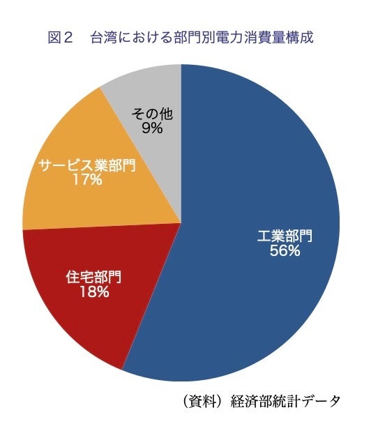 近年、電力消費の5割以上を占めている。20年~21年は新型コロナに苦しめられたが、世界で一番成功したと言われる台湾政府の感染予防対策が功を奏し、製造活動には大きな影響はなかった。その上、台湾政府による中国進出台湾企業(台商)に対するUターン投資奨励もあったため、20年は前年比2.1%増、21年は同7.1%増となった。しかし、22年に入ってからはロシアによるウクライナ侵攻の発生、高止まりするインフレ率、さらに下半期には海外需要の縮小などの要因があり、工業部門の消費電力量は同2.8%減となった。