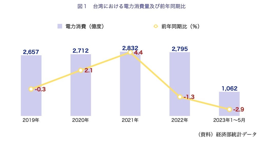 景気と生活は電力消費量と強い相関関係がある。経済部能源局(エネルギー局)の統計によると台湾の電力消費量は、2018年は2666億キロワット時(kWh)だったが、22年には2795億kWhに達しており、年平均1.2%増加している。中でも20年は同2.1%増、21年は同4.4%増と特に多かった。新型コロナウイルスの感染対策に伴うリモートワークや遠隔授業向けで工業および住宅向けの電力需要が急増したためだ。22年下半期からは世界経済の減退に伴って製造生産活動が縮小したことや、感染予防対策の緩和を受けてリモートワークなどが減少したため当該部門の電力需要が減少し、22年通年の電力消費量は前年比1.3%減となった。23年も22年から引き続き世界経済の減退、メーカーの在庫調整、稼働率抑制などがあるため、1~5月の電力消費量は前年同期比2.9%減となっている。