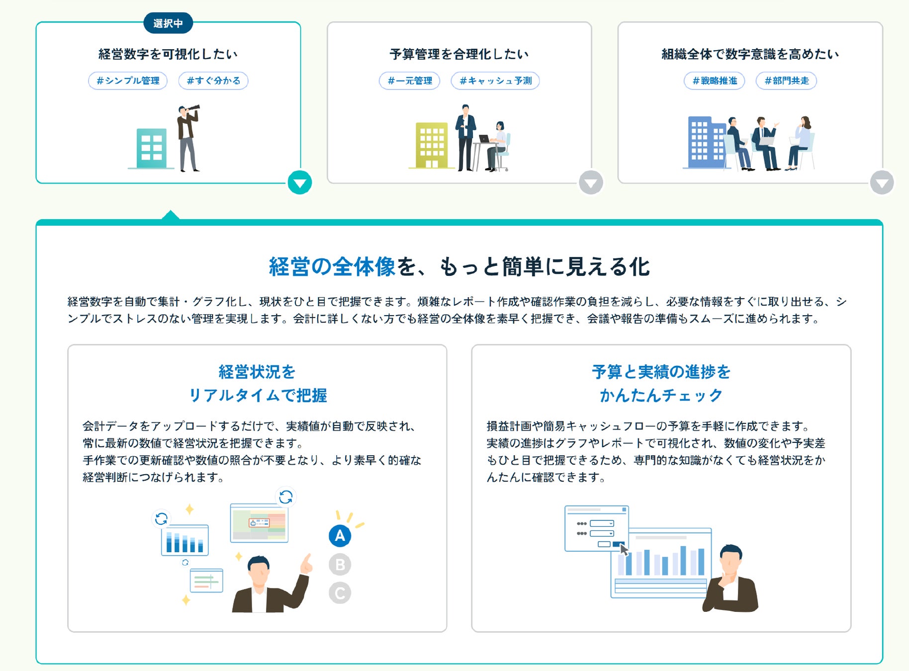 これまで『bixid(ビサイド)』は多彩な機能を提供してまいりましたが、多機能であるがゆえに、経営者や経理・経営管理担当者から「どの業務にどの機能を活用すればよいか判断しづらい」という声が寄せられていました。今回のリニューアルでは、役割別の視点に立ち 、企業課題に即した導入後の活用イメージを明確に伝えることを目的としております。