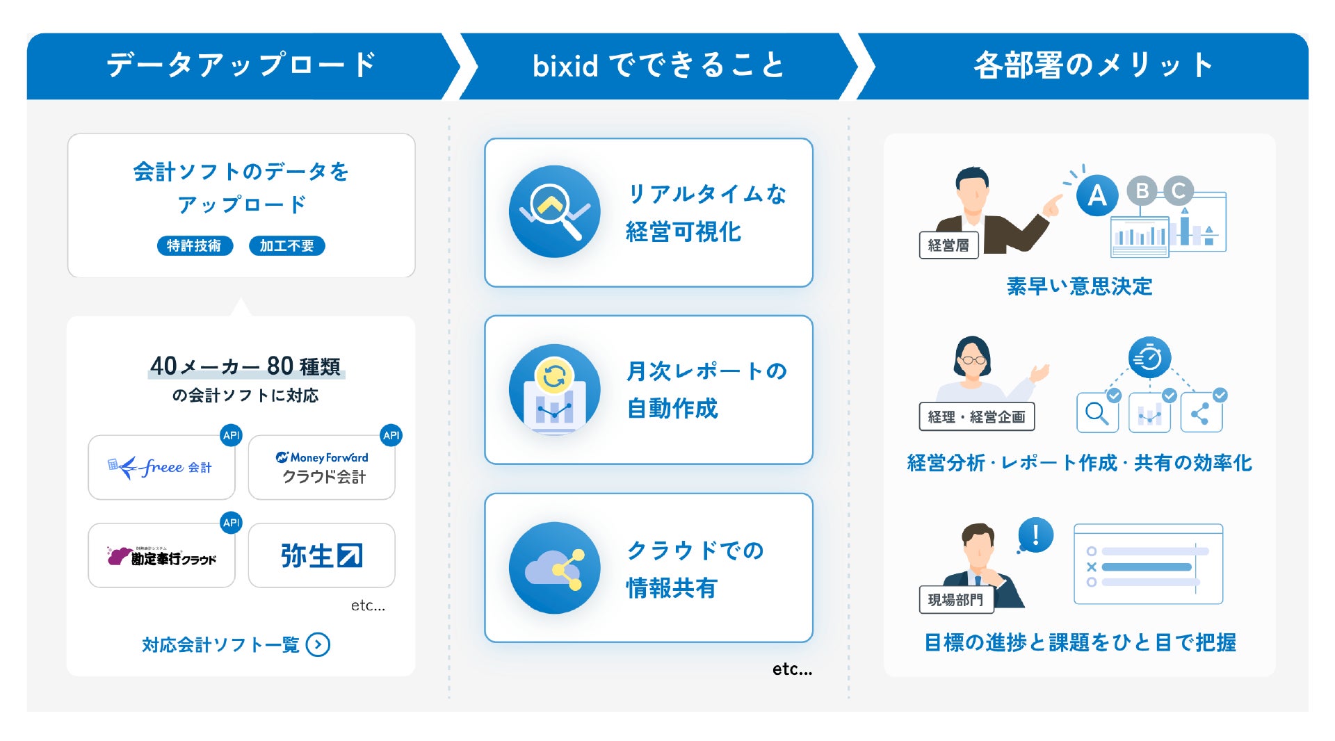 『bixid(ビサイド)』が提供できる3つのメリットを全体像として提示し、経営層、経理・経営企画、現場担当など、組織内の立場に応じた導入メリットを容易に把握できる構成としています。