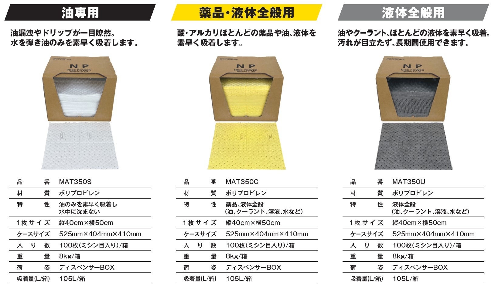 油専用、薬品・液体全般用、液体全般用の3種類の吸着マット。