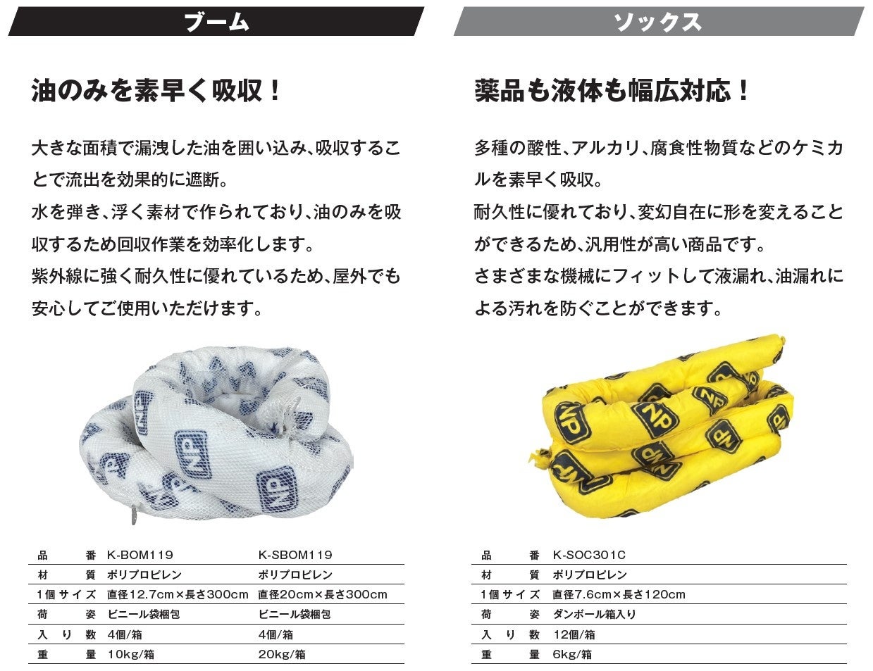 NP ソックスは薬品などの液体全般を吸収させることができ、様々な機械などの形に合わせて設置が可能です。