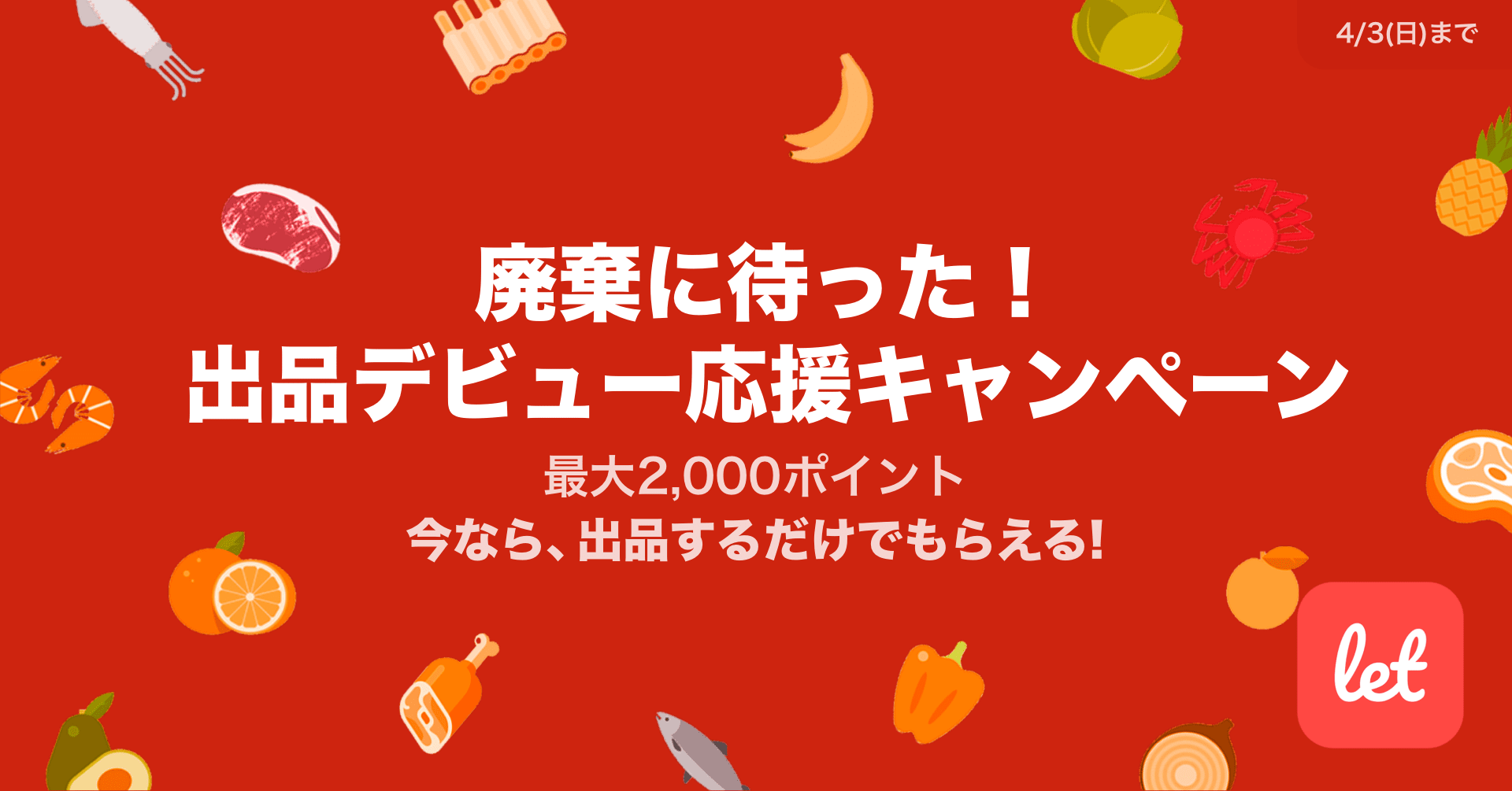 株式会社レット(本社:東京都港区、代表:佐藤 航陽)が運営する、食品ロス/在庫ロス削減のマーケット「Let(レット)」内で「廃棄に待った! 出品デビュー応援キャンペーン」を3月29日(火) 正午より開催します。はじめて「食品」を出品した方ならどなたでも、アプリ内のお買い物に利用できるポイント最大2,000円分をプレゼントいたします。レットでは最短1分で簡単に商品の販売が可能で、獲得ポイントはアプリ内の商品購入にご利用いただけますので、ご自身で生産されているお野菜や果物などの販売にこの機会を是非ご利用ください。