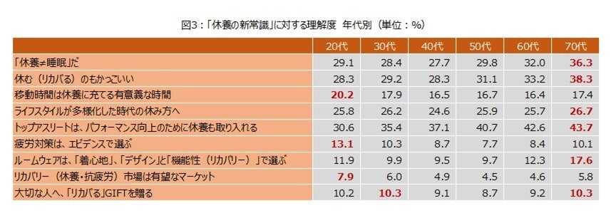 年代別に「休養の新常識」に対する理解度を見ると、6項目で70代が最も高い結果となりました。