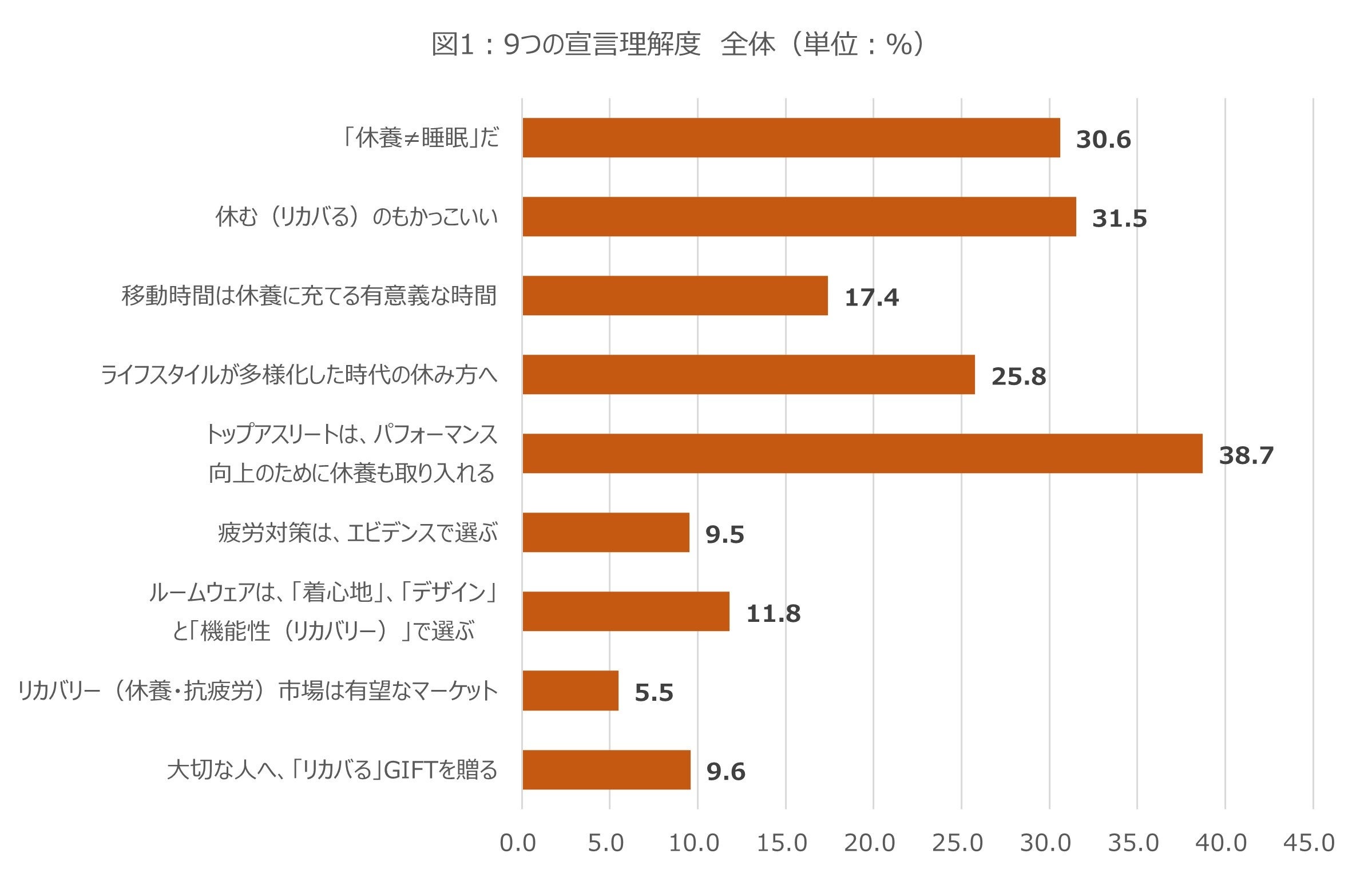 当社は2024年3月に、現代の日本人の約8割が「疲れている」と感じていることから、「休む(リカバリーする)こと」を意味する造語「リカバる」をキーワードに、「休むこと」に対して罪悪感を抱きがちだったこれまでの考え方、“旧世代の休養の常識”を、当社が考える“休養の新常識”として刷新する「休養の常識を変える9の宣言」を発表。ひとりひとりのライフスタイルに合った様々な「休養」ソリューションを伝えるべく活動しています。今回の分析は、そんなベネクスが提案する「休養の新常識」に対する理解度を見ていきます。