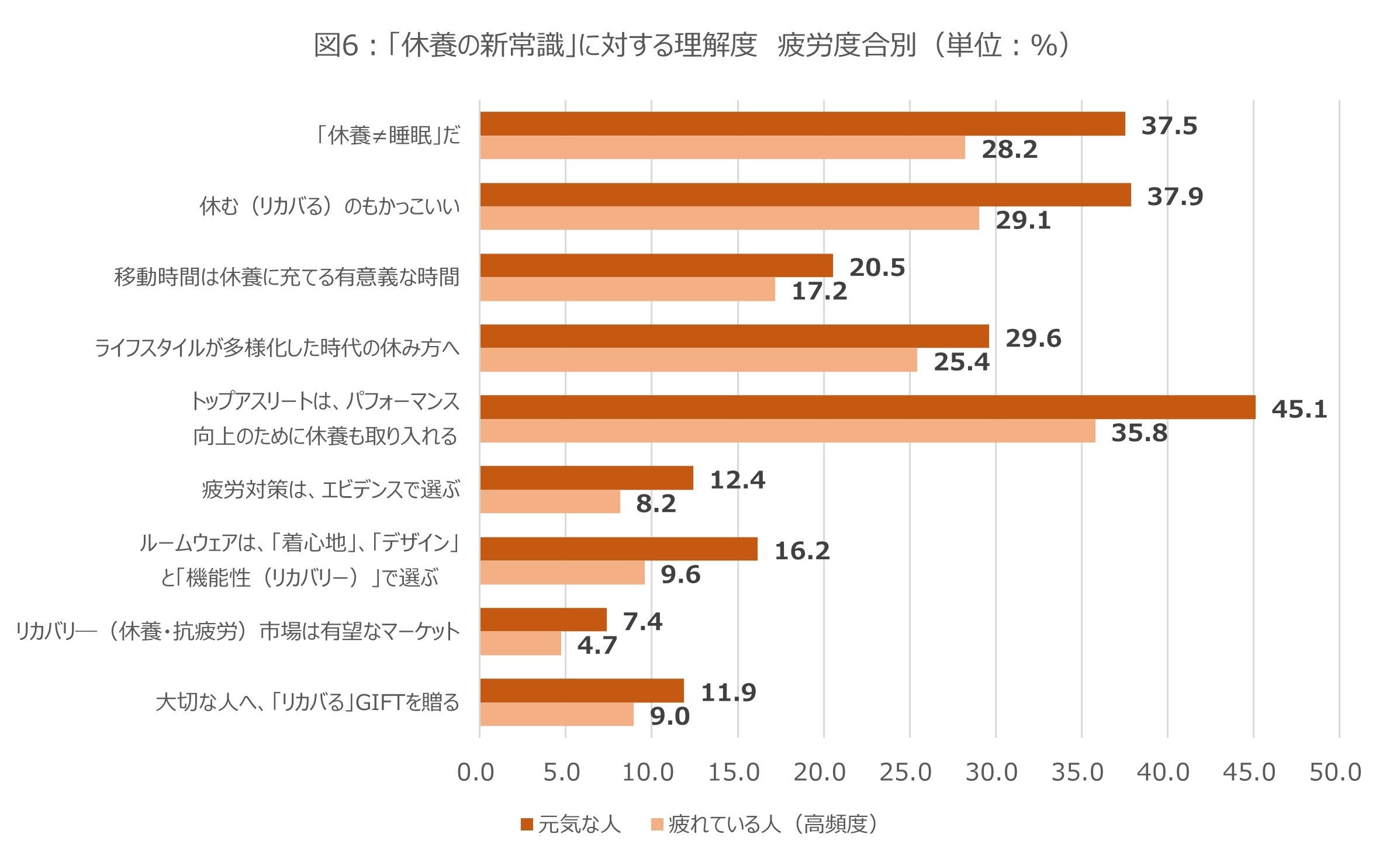 疲労度合別に見ると、全体的に元気な人の方が、疲れている人よりも「休養の新常識」の理解度が高い傾向があり、健康のための3要素のうちの「休養」が、元気で過ごす秘訣になっていることが伺えます。
