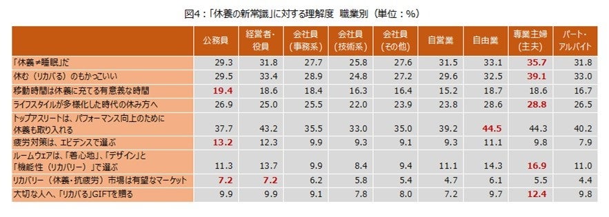 職業で理解度を比較すると、専業主婦(主夫)で、「休養の新常識」に対する理解度が高いことが分かりました。また、次に項目が多かったのが公務員となりました。