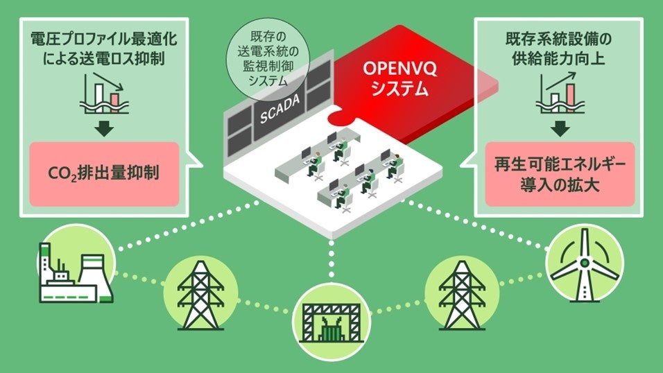 OPENVQは、系統制御システムから電力系統の設備データや計測データを取り込み、発電計画や気象予測などの外部情報と組み合わせることで、将来の系統潮流・需給バランスを予測します。さらに電圧安定度を確保した上で、電圧・無効電力をオンラインで最適制御することにより、送電ロスの抑制をはじめとした電力系統運用の高度化・効率化を実現するシステムです。