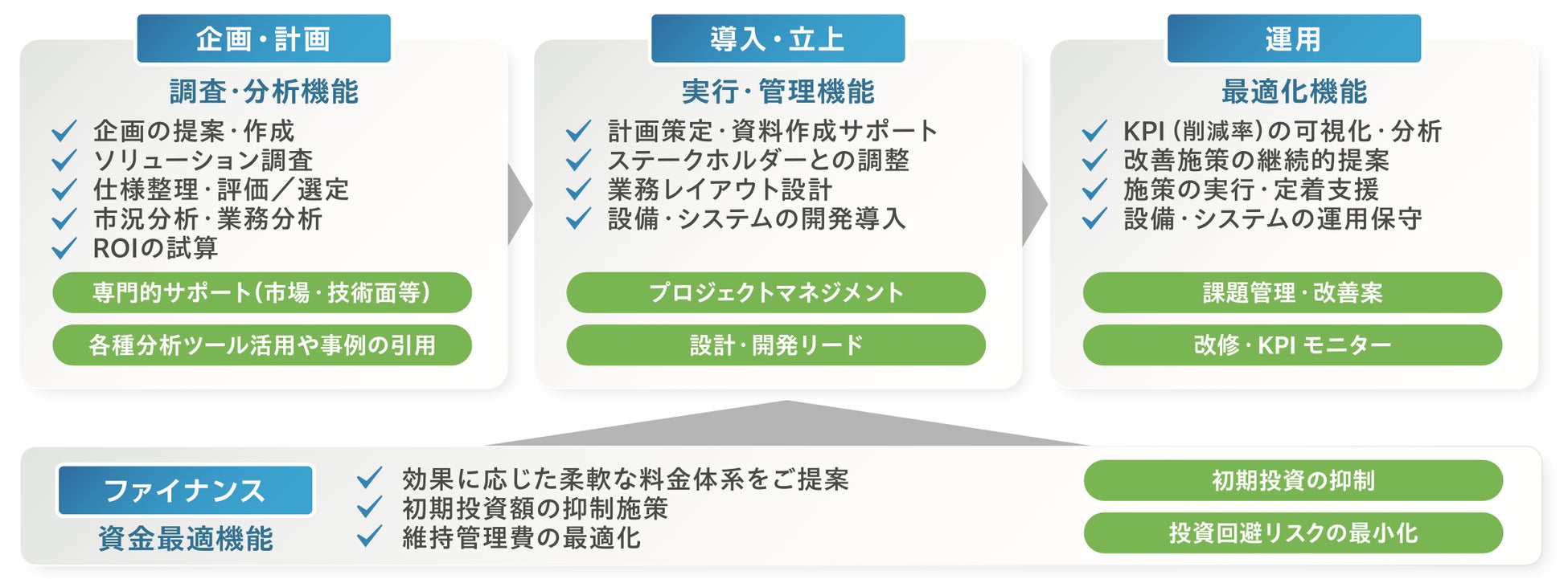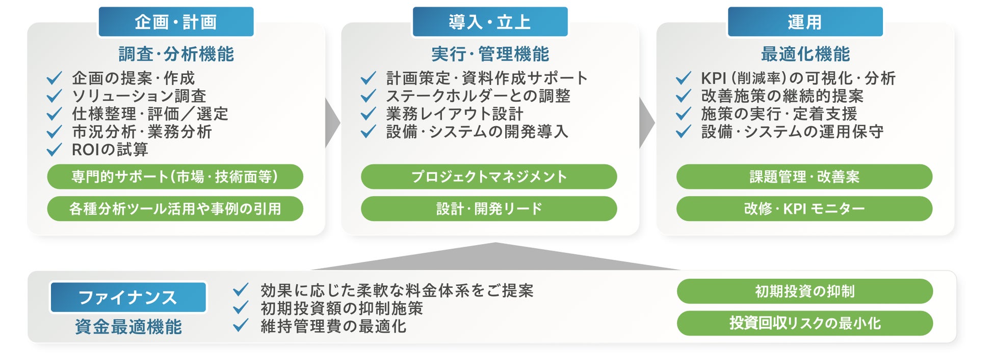 お客さまと同じ経営視点に立ち、物流戦略の立案から実行までトータルで支援します。さらに、初期投資を抑えながら、確実に成果を上げていく提案も行うことで、コスト面での負担を軽減し、安心して物流の課題解決に取り組んでいただけるようサポートいたします。