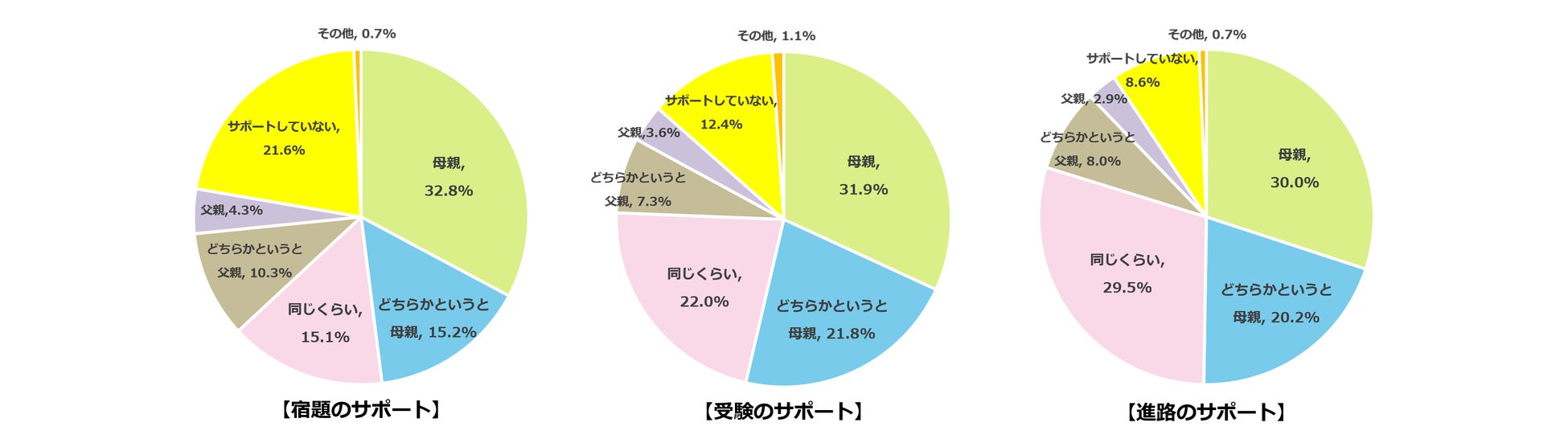 夫婦間での学習サポートについて、「宿題サポート」「受験サポート」「進路サポート」それぞれの分担割合について質問しました。その結果、「宿題サポート」については、48.0%が「母親」(母親:32.8%、どちらかというと母親:15.2%)、「受験サポート」については、53.7%が「母親」(母親:31.9%、どちらかというと母親:21.8%)、「進路サポート」については、50.2%が「母親」(母親:30.0%、どちらかというと母親:20.2%)と回答しました。共働き家庭の子どもの学習については、多くの場面で母親がサポートしていることがわかりました。