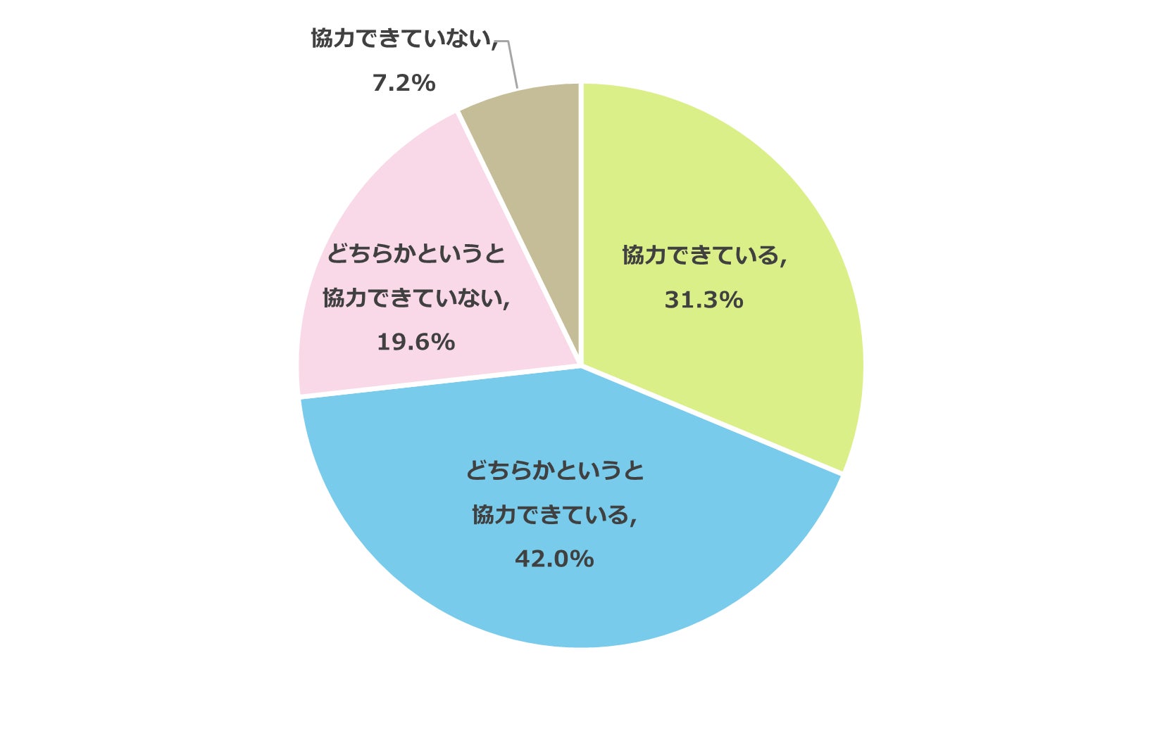 子どもの教育について、夫婦間で協力ができていると思うか質問しました。その結果、73.3%が「協力できている」(協力できている:31.3%、どちらかというと協力できている:42.0%)と回答しました。