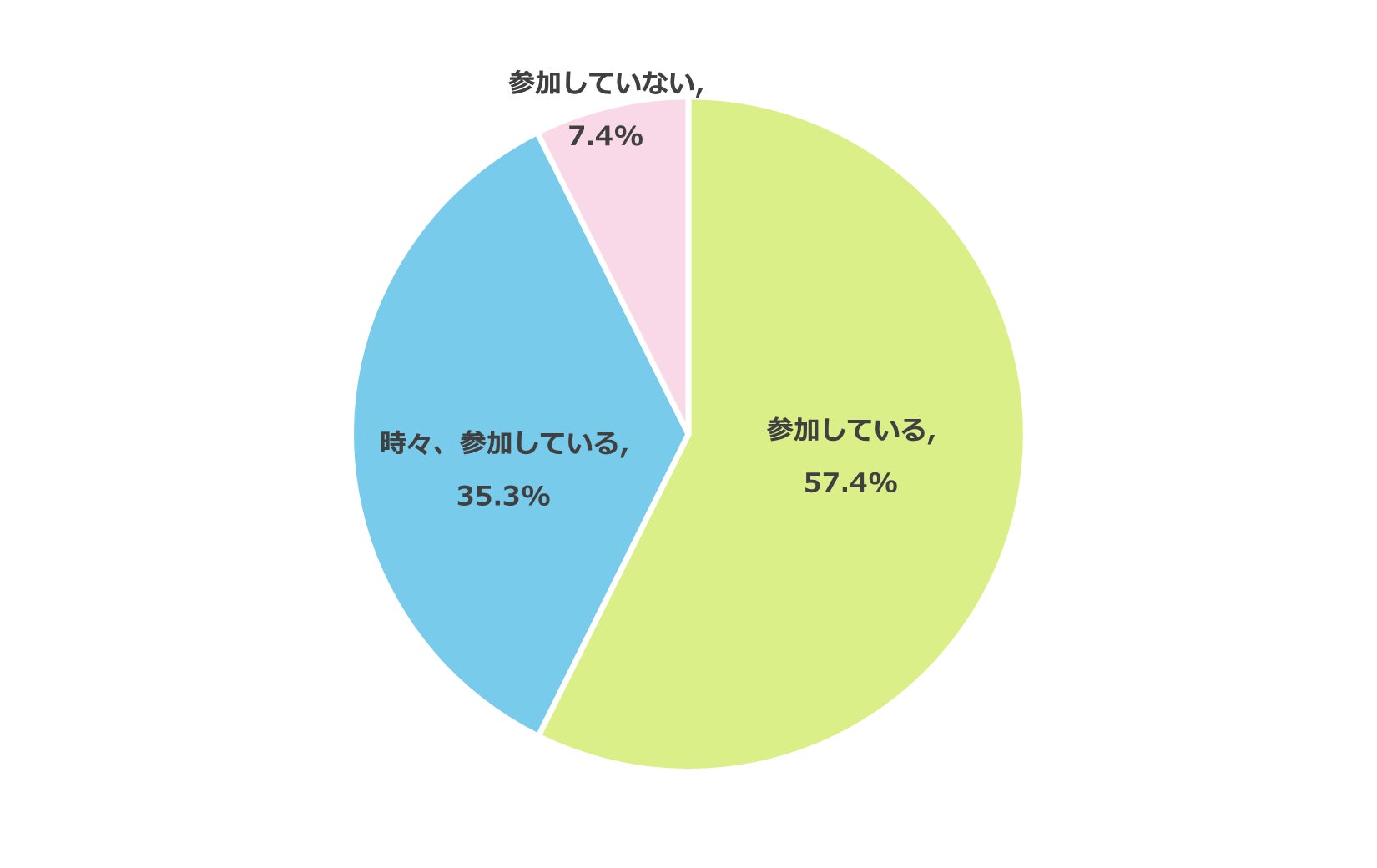 次に、授業参観など子どもの学校行事に参加しているか質問しました。その結果、「参加している」が57.4%、「時々、参加している」が35.3%、合わせると92.7%の共働き家庭が学校行事に参加していることがわかりました。