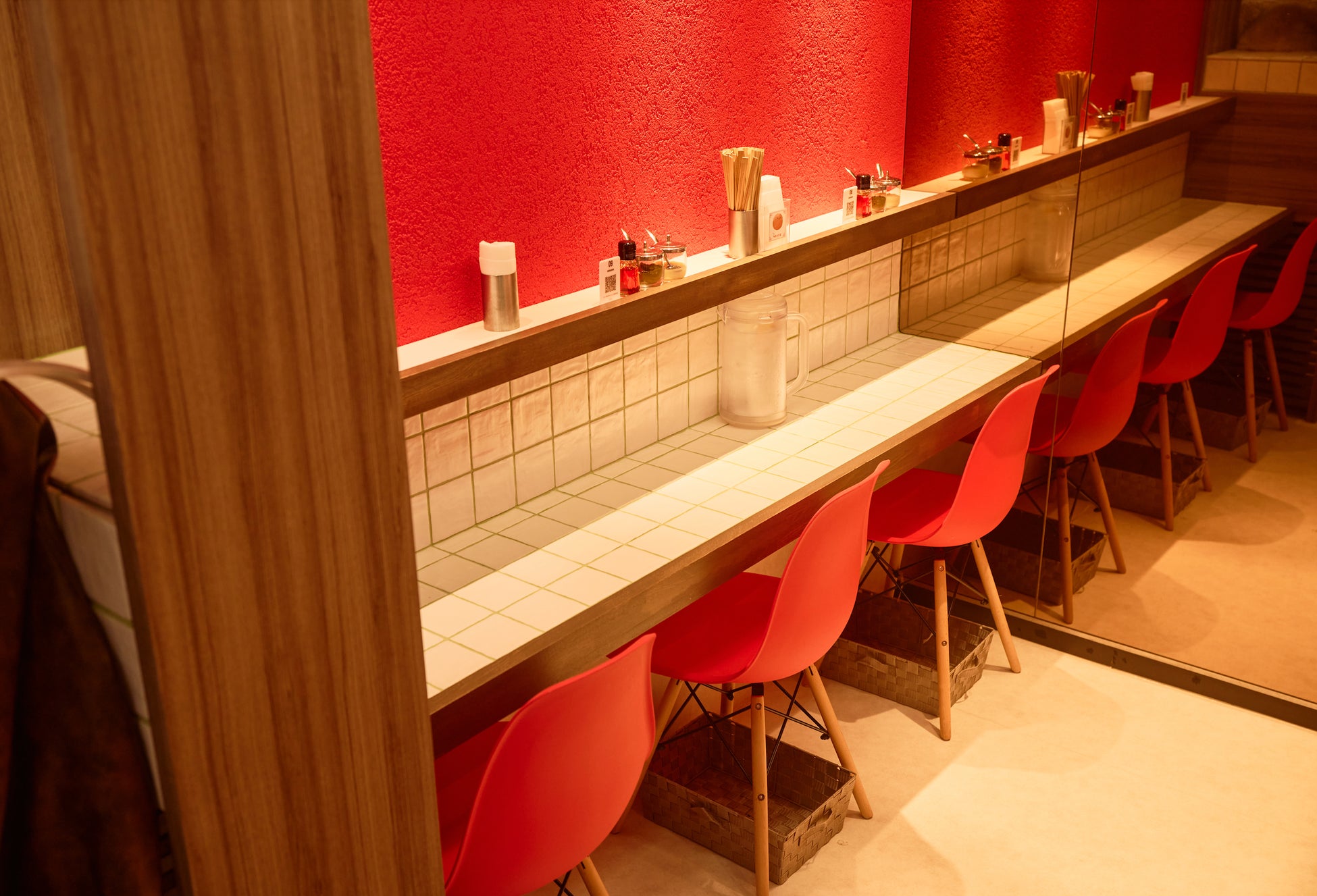 店内はブランドカラーである赤を基調としたデザインで、麻辣湯の“しびれ(麻)・辛さ(辣)”の世界観を視覚的に表現しています。カウンターとテーブルを中心に14席を設け、ひとりでも気軽に利用しやすい空間に仕上げました。