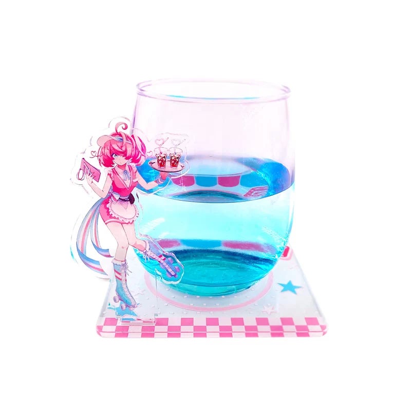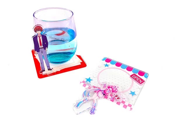 アクスタは自由な形で作成可能。コースターに挿入することで、キャラクターがドリンク前に立体的に浮かび上がり、視覚的なインパクトを与えます。