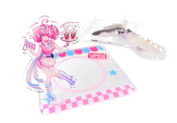 本商品は、アクリルスタンド(アクスタ)とアクリルコースターの両方を完全オリジナルで作成可能。1個からの注文に対応しており、推し活グッズやイベント記念品、ノベルティとして幅広くご利用いただけます。さらに、コースター部分にはドリンクを置いてもデザインが映える仕上がりに、またアクスタを挿せばキャラクターがドリンク前に立体的に演出されるという斬新なコンセプトが特徴です。