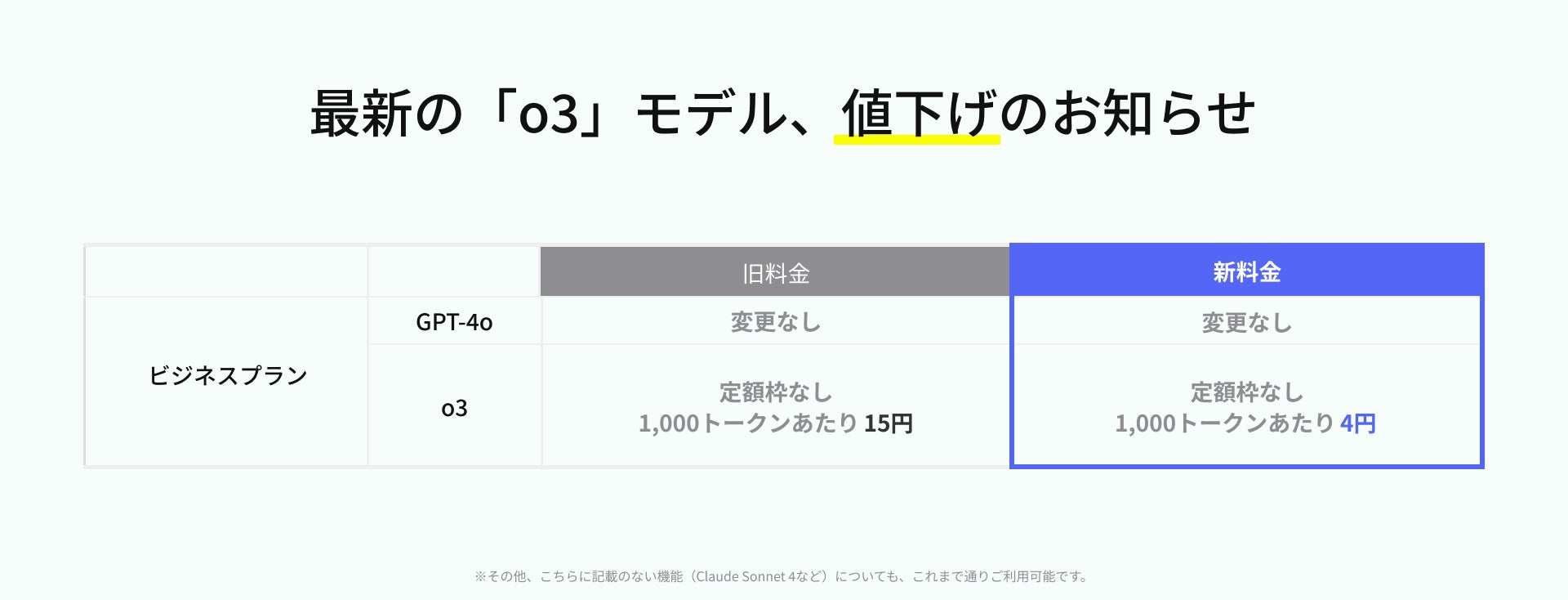新しいビジネスプランの料金体系では、OpenAI社による最新の生成AI「o3」モデルについて、1,000トークンあたり4円と、これまでの3割以下の料金に値下げされます。